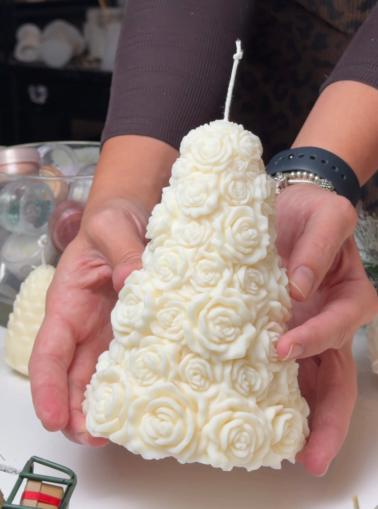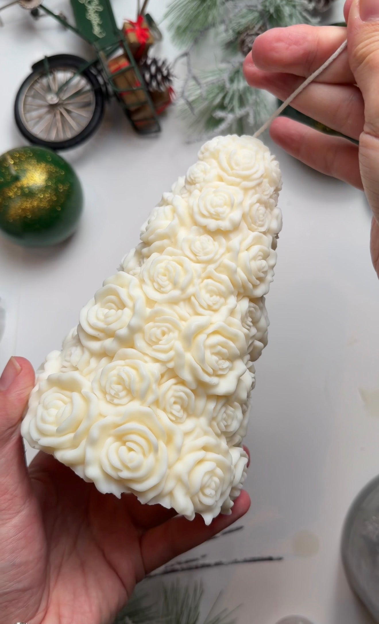 Enhance your holiday ambiance with the romantic elegance of our Rose Christmas Tree Soy Wax Candle. Handcrafted from premium soy wax, this candle is beautifully sculpted into a blooming Christmas tree made entirely of delicate roses. Its soft white hue and intricate floral details make it a stunning addition to your seasonal décor.